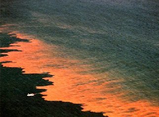 This picture shows an algal bloom, where the species of algae releases a pigment (a carotenoid) into the water. The colouration of such blooms is the source of the term "red tide" which is also sometimes used to describe an algal bloom. The red pigment is usually released on the death of the bloom as the structure of the algae breaks down and releases the pigment. |