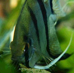 THis freshwater angelfish is a good example of a compressed fish. It has a tall body which is very narrow across the back.