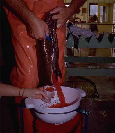 The picture shows the salmon being cut open to remove the eggs. Such a process requires the fish to be killed. Some salmonid species will regain condition and be able to spawn again the following year. these species can be stripped by applying pressure to the abdomen and squeezing the eggs out, a process which does not kill the fish |