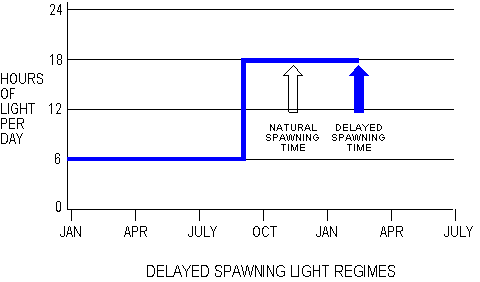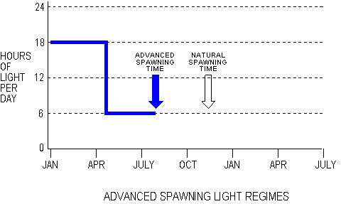 Photoperiod control can be used to advance or delay the spawning process of many salmonids. A schedule or advancement and retardation of Rainbow Trout spawning is given. | ||